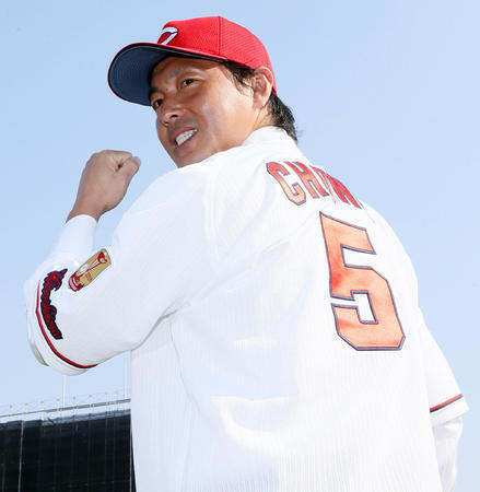 巨人時代の7ではなく、背番号5のホームユニホーム姿も披露。カメラマンが撮影したデジカメのモニターをのぞき込むなど、ちゃめっ気も見せた。
