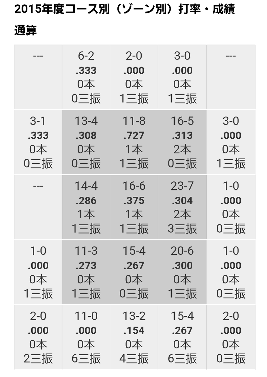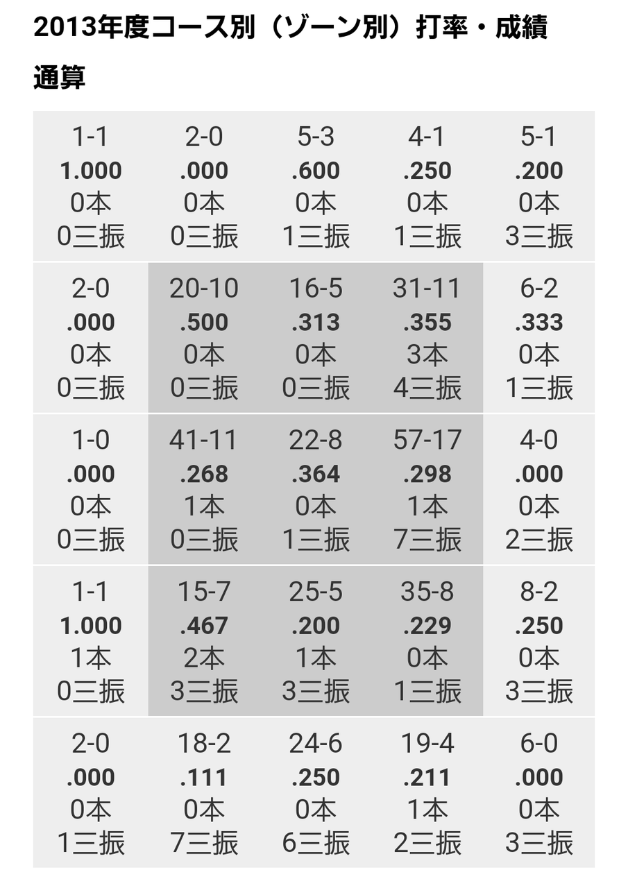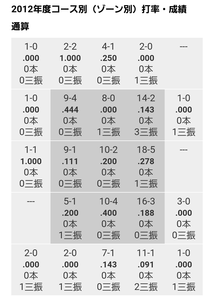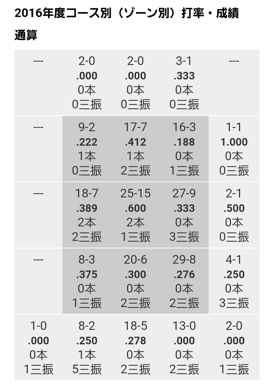 一方で真ん中低め、外角低めのストライクゾーンの打率は良くない
