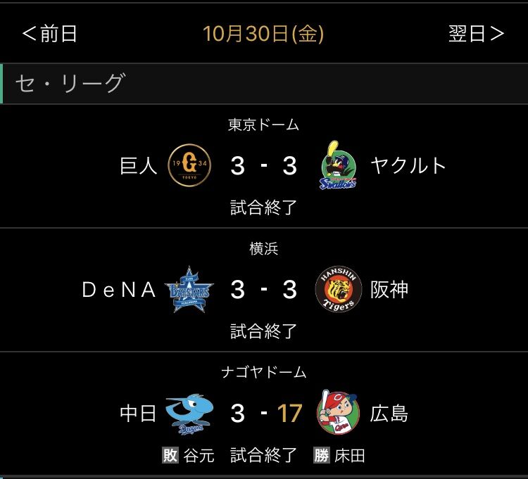 今日の優勝はセリーグ全ての試合が絡んでるな