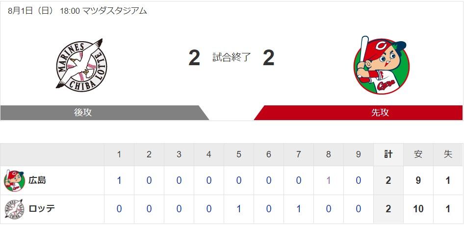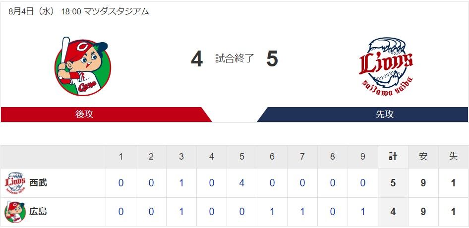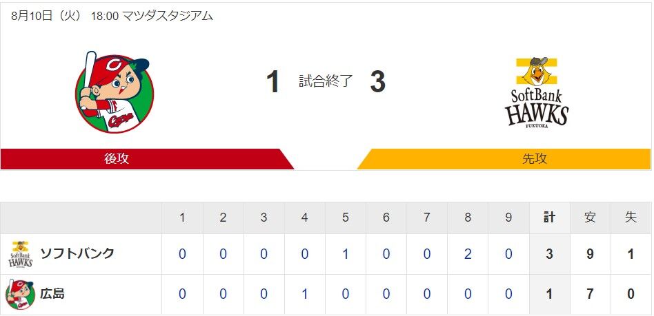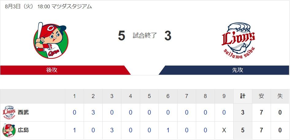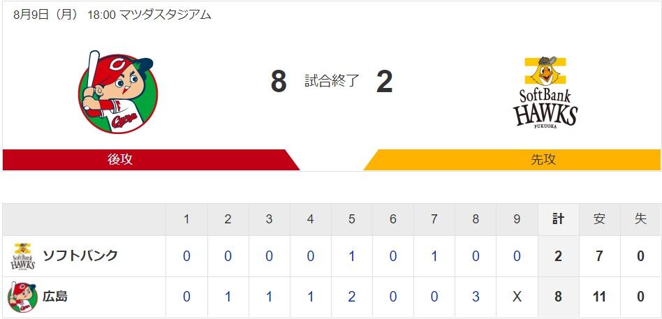 9 広島 09試合 3勝 5敗 1分 .375 得点33 失点39 本05 盗03 率.288 防3.89 失02