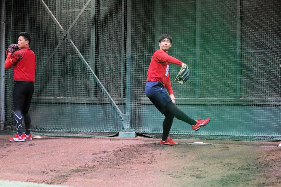 #森下暢仁 投手も初日からブルペン入り!(撮影・加藤孝規)#carp #カープ #沖縄キャンプ pic.twitter.com/KE0RZZe5cp