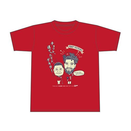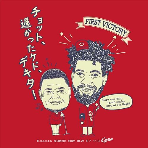 そしてこの度、コルニエル選手の来日初勝利を記念し、そのヒーローインタビューの際に、フェリシアーノ通訳が「チョット、遅かったケド、デキタ。ウレシイデス」とたどたどしい日本語で球場を沸かせたシーンを、ユニークなタッチで漫談風にデザインしたTシャツを本日、ただいまより明日10月23日(土)13時までの時間限定にて受付いたします。